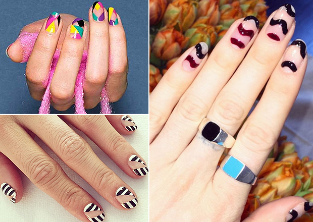 Para quem não abre mão de inovar, as nail arts permanecem, e agora é a vez de investir nos espaços negativos. “Os modelos com espaço negativo são tendência, deixando uma parte transparente na unha entre formas geométricas coloridas. Basta colocar toda a sua criatividade na hora de fazer o desenho”, indica Gi Camargo, do Gi Camargo Nail Bar.